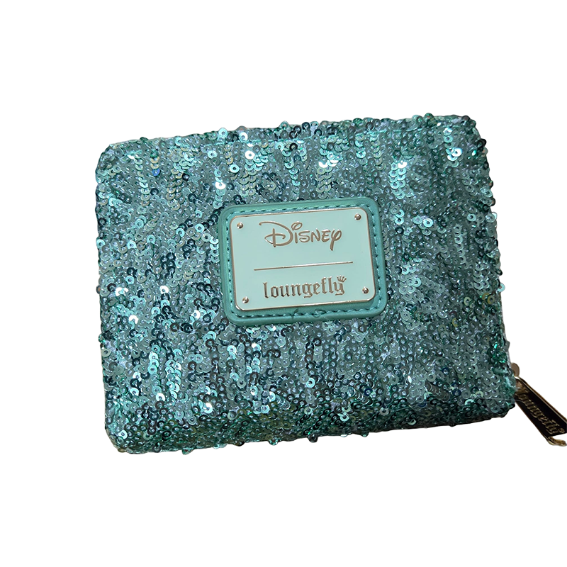 Loungefly Disney Tinker Bell Holiday Tri-Fold Wallet. It is an officially licensed Disney product made from vegan-friendly faux leather with green sequins, a gold-tone Tinker Bell metal charm, and embossed holly leaves.