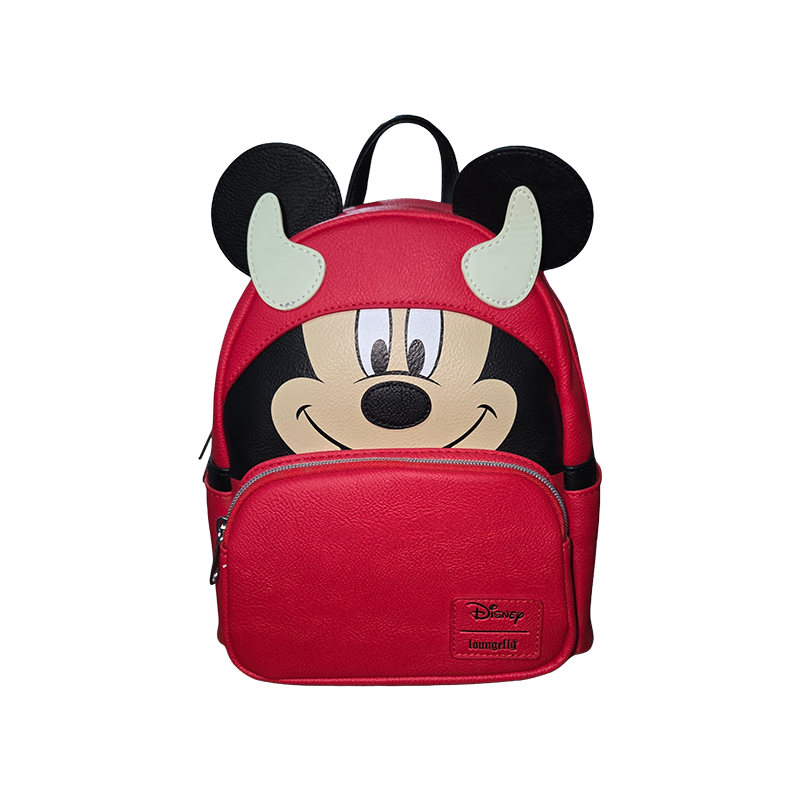 Loungefly Disney Mickey Mouse Halloween Devil Mini-Backpack, an Entertainment Earth Exclusive. It features a red faux-leather design with a Mickey Mouse devil costume theme, complete with glow-in-the-dark horns and ears.