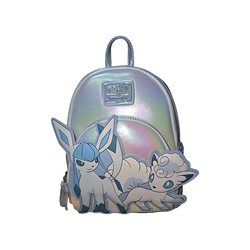 Loungefly Pokémon Ice Type Winter Mini Backpack, featuring the Pokémon Glaceon and Alolan Vulpix. The mini backpack is made from faux leather with an iridescent finish and appliqué details.