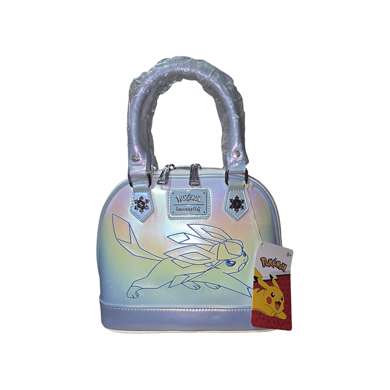 Loungefly Pokémon Ice Type Winter Handbag. This officially licensed accessory features embroidered Glaceon and Alolan Vulpix Pokémon, an iridescent finish, and snowflake-shaped metal rivets.