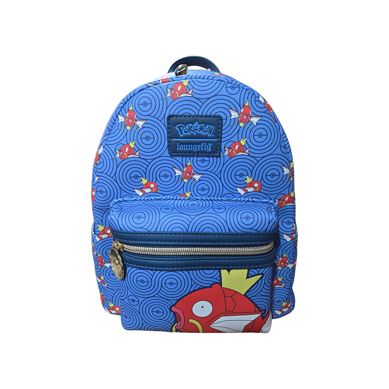 Loungefly Pokémon Magikarp Mini Backpack. It is an officially licensed product made from faux leather with an all-over print of the Pokémon Magikarp in a water-themed design.