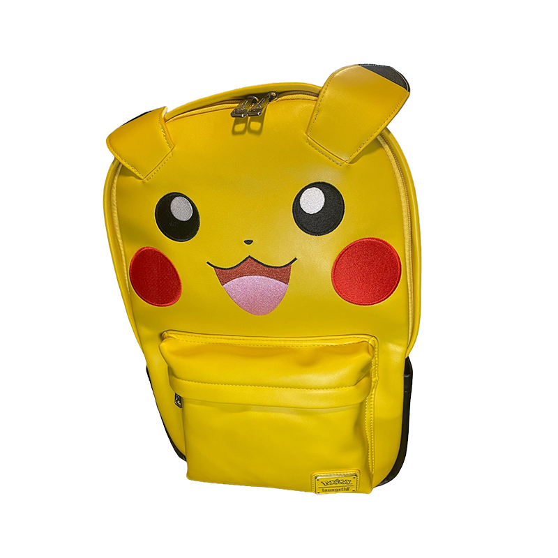 Loungefly Pokémon Pikachu Full-Size Backpack. This officially licensed backpack is designed in a cosplay style, featuring appliques and printed details of Pikachu's face, including 3D ears on top.