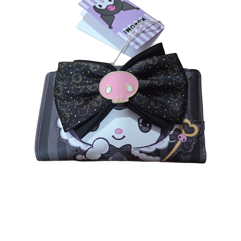 Loungefly Sanrio Kuromi 20th Anniversary Bi-Fold Wallet. It is a popular accessory for fans of the Sanrio character Kuromi and is part of a collection celebrating her 20th anniversary.