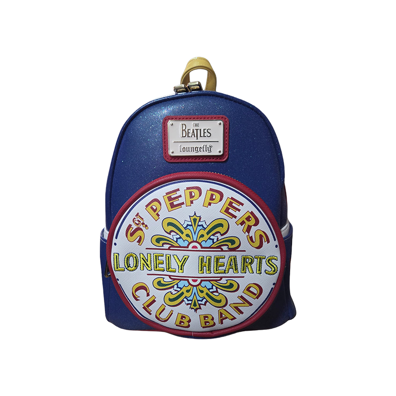 Loungefly The Beatles Sgt. Pepper's Lonely Hearts Club Band Mini Backpack. This officially licensed product features design details inspired by the iconic 1967 album cover, including the central drum graphic and signature striped side pockets.
