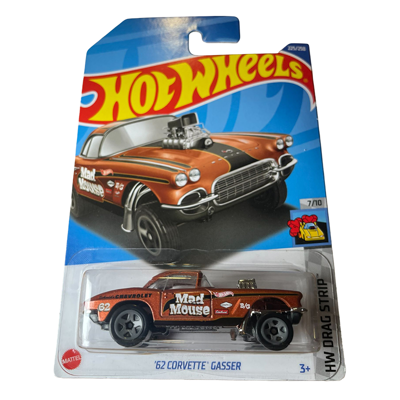 Hot Wheels '62 Corvette Gasser, specifically the "Mad Mouse" version released in 2022. It is part of the HW Drag Strip series, where it is numbered 7/10.