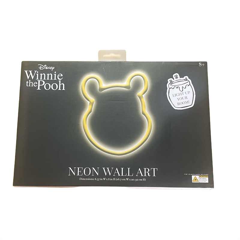 Disney Winnie the Pooh Neon Wall Art features a soft yellow neon outline of Pooh's head. It is a battery-operated light designed for wall decoration, measuring approximately 8 inches tall and 6.57 inches wide.
