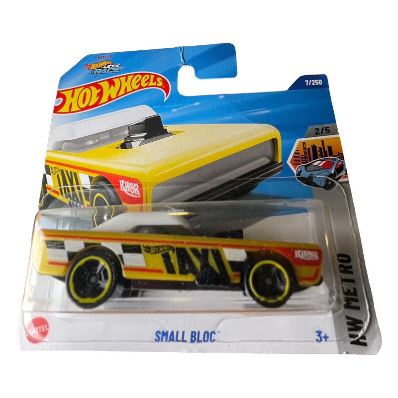 Hot Wheels Small Bloc, appearing here in its 2025 "Taxi" livery. This model is part of the HW Metro series, specifically numbered 2/5 in that set and 7/250 in the overall 2025 mainline collection